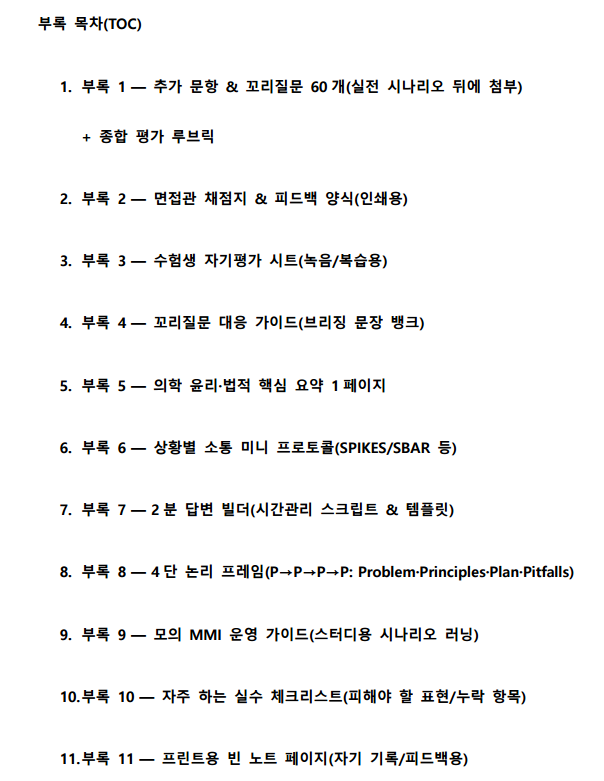 - 110개 (본문 50개+꼬리질문, 부록 60개+꼬리질문) 의대 면접 시나리오 수록
